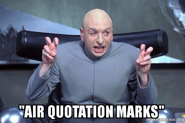 Quotation marks, unlike other punctuations, figure in verbal conversations – with the air quote – seen here, in the image of Dr. Evil (from the film Austin Powers). See how he raises his hands, fingers curled with two fingers peeking out pantomiming the quotation mark to emphasize a point or drip sarcasm.